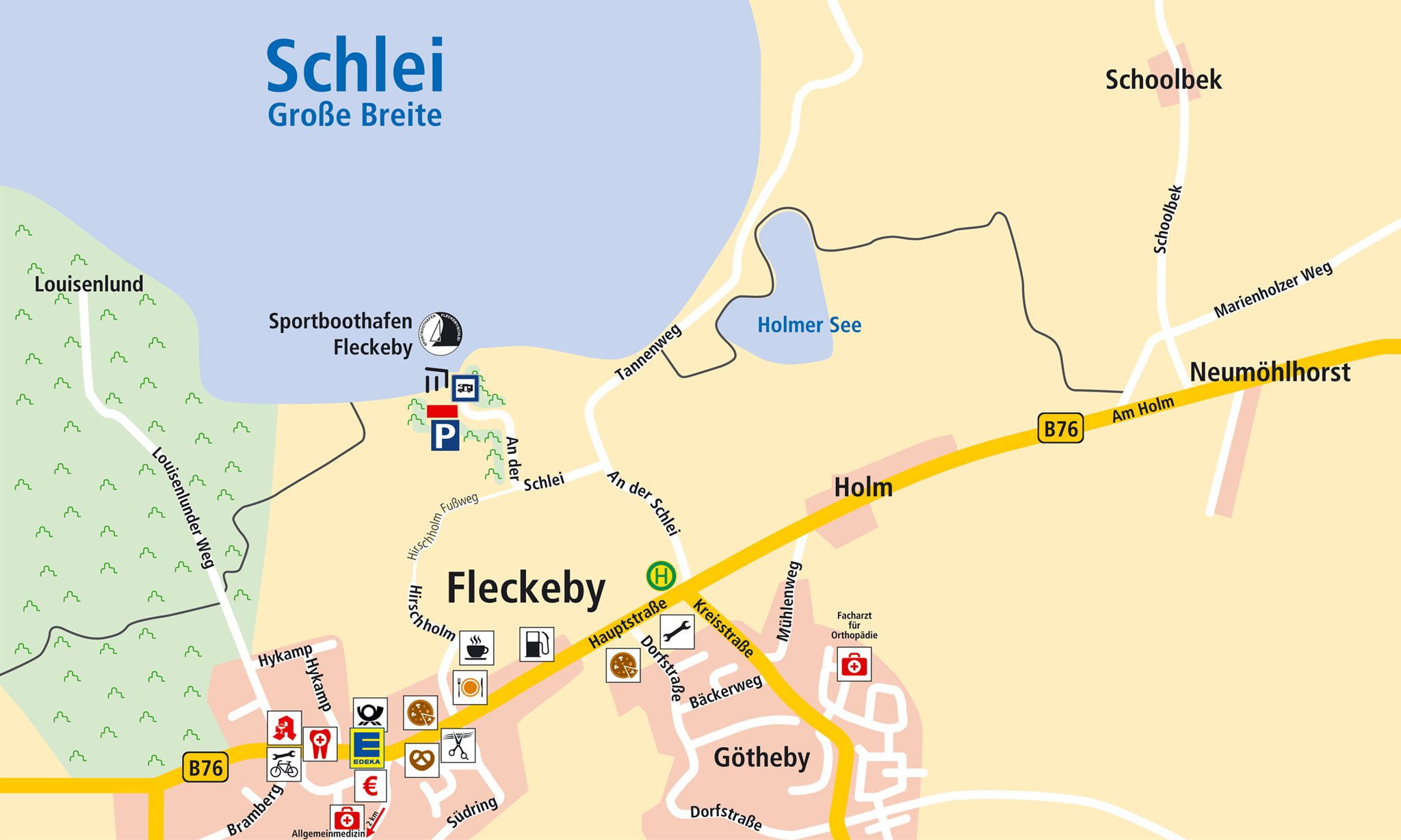 In der Ortschaft Fleckeby, finden Sie alles, was Sie für den täglichen Bedarf benötigen. Fußläufig sind Sie in 20 Minuten am Edeka-Markt. Mit dem Fahrrad brauchen Sie ca. 10 Minuten.